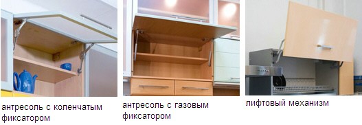 Механизмы открывания верхних шкафов Антресольные шкафы открываются вверх, поэтому кроме петель в них устанавливаются фиксаторы — газовые или коленчатые, чтобы дверь не приходилось придерживать. Коленчатый фиксатор позволяет фиксировать дверь в любом положении, насколько бы широко вы ее не открыли. Газовый — плавно открывает дверь и фиксирует ее в горизонтальном положении. Лифтовый механизм позволяет открыть дверцу в вертикальном положении — она точно не будет мешать вам. Этот механизм удобно устанавливать в сушки для посуды.