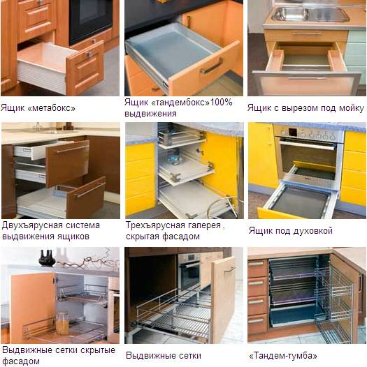 Системы выдвижения и скрытого хранения Создавая ту или иную модель, дизайнеры фабрики «Комфорт» прежде всего задумываются над тем, насколько удобно ей будет пользоваться. Стараются сделать так, чтобы все было на своем месте и под рукой. Для кухни аксессуары являются важнейшими составляющими. Именно поэтому в производстве мебели мы используем механизмы, которые позволяют наиболее эффективно использовать внутренне пространство шкафов, особенно труднодоступные углы и ниши. Выдвижные колонки, «волшебные уголки» и карусели значительно «расширяют» объем шкафов, позволяя оптимально использовать имеющееся пространство. Не стоит забывать и о том, что срок службы мебели во многом зависит от добротности фурнитуры.