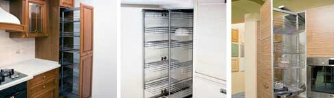 Колонки Каждая хозяйка знает, как удобен большой шкаф-колонка. В него помещается огромное количество посуды, продуктов и разных кухонных принадлежностей. Но, как показывает практика, пользоваться ими бывает сложно, так как предметы загораживают друг друга. Решить эту проблему помогают выдвижные колонки с сетками.