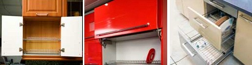 Сушки для посуды Сушки для посуды могут быть разных размеров, располагаться как в верхних, так и в нижних шкафах — выбирайте более удобную.