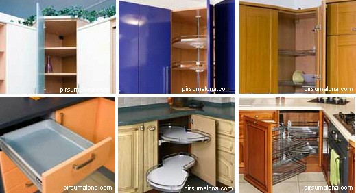 Наполнение угловых тумб и шкафов Размещая кухню по двум стенам, мы не можем обойтись без угловой тумбы (линейной, г-образной или диагональной). Но как максимально использовать объем этой большой тумбы? Что в ней может быть кроме обычных полок? Эти тумбы наполняются очень удобными аксессуарами: «карусель» и «волшебный уголок».верхнем угловом шкафу кроме полок можно разместить «карусель» или сушку для посуды.